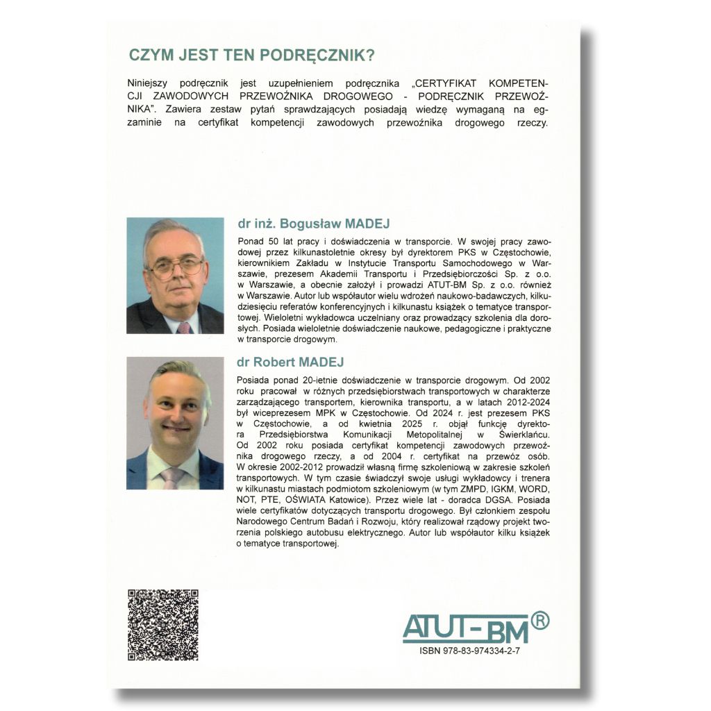 Książka została napisana przez Bogusława Madeja i Roberta Madeja, uznanych specjalistów w dziedzinie transportu, którzy od lat zajmują się przygotowaniem kandydatów do egzaminu na certyfikat kompetencji zawodowych. Ich wiedza oraz doświadczenie pozwoliły stworzyć materiał wysokiej jakości, który jest zarówno merytoryczny, jak i łatwy w przyswajaniu.